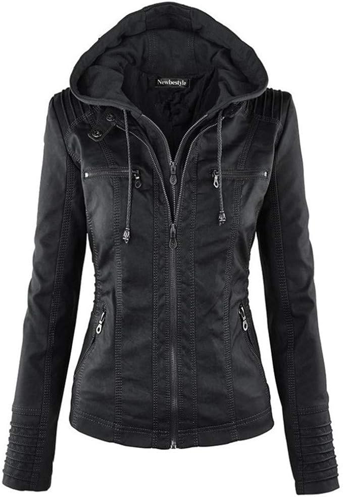 Women Hooded Moto Biker Jacket Full Zip Pleated Overcoat Casual Coat