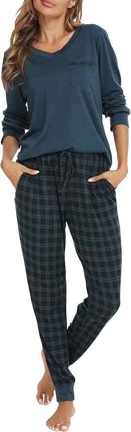 Long Sleeve Tops and Plaid Pants Sleepwear with Pockets Drawstring