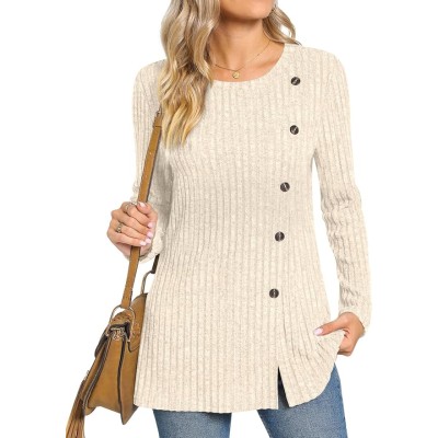 Women's Long Sleeve Jumpers Crewneck Tunic Tops with Button Sides