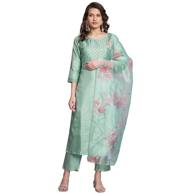 VredeVogel Women's Silk Blend Embroidered Straight Kurta Pant Set with Organza Dupatta