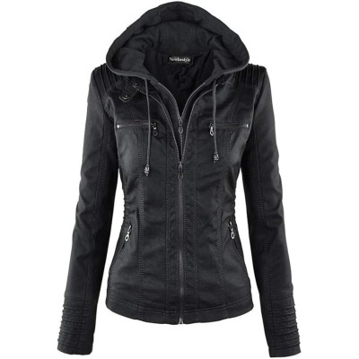 Women Hooded Moto Biker Jacket Full Zip Pleated Overcoat Casual Coat