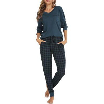 Long Sleeve Tops and Plaid Pants Sleepwear with Pockets Drawstring