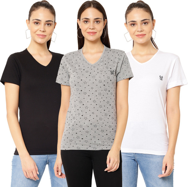 Pack of 3 Women Solid V Neck Cotton Blend Multicolor T-...