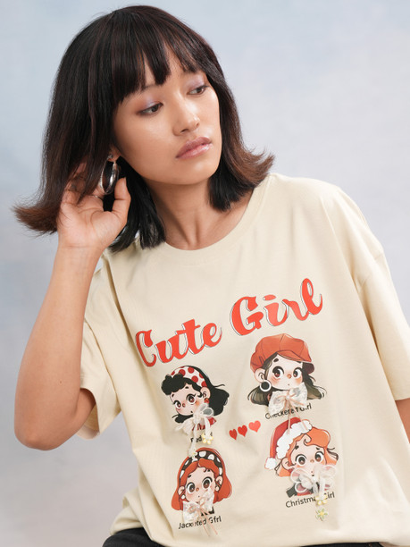 Women Printed Round Neck Pure Cotton Beige T-Shirt